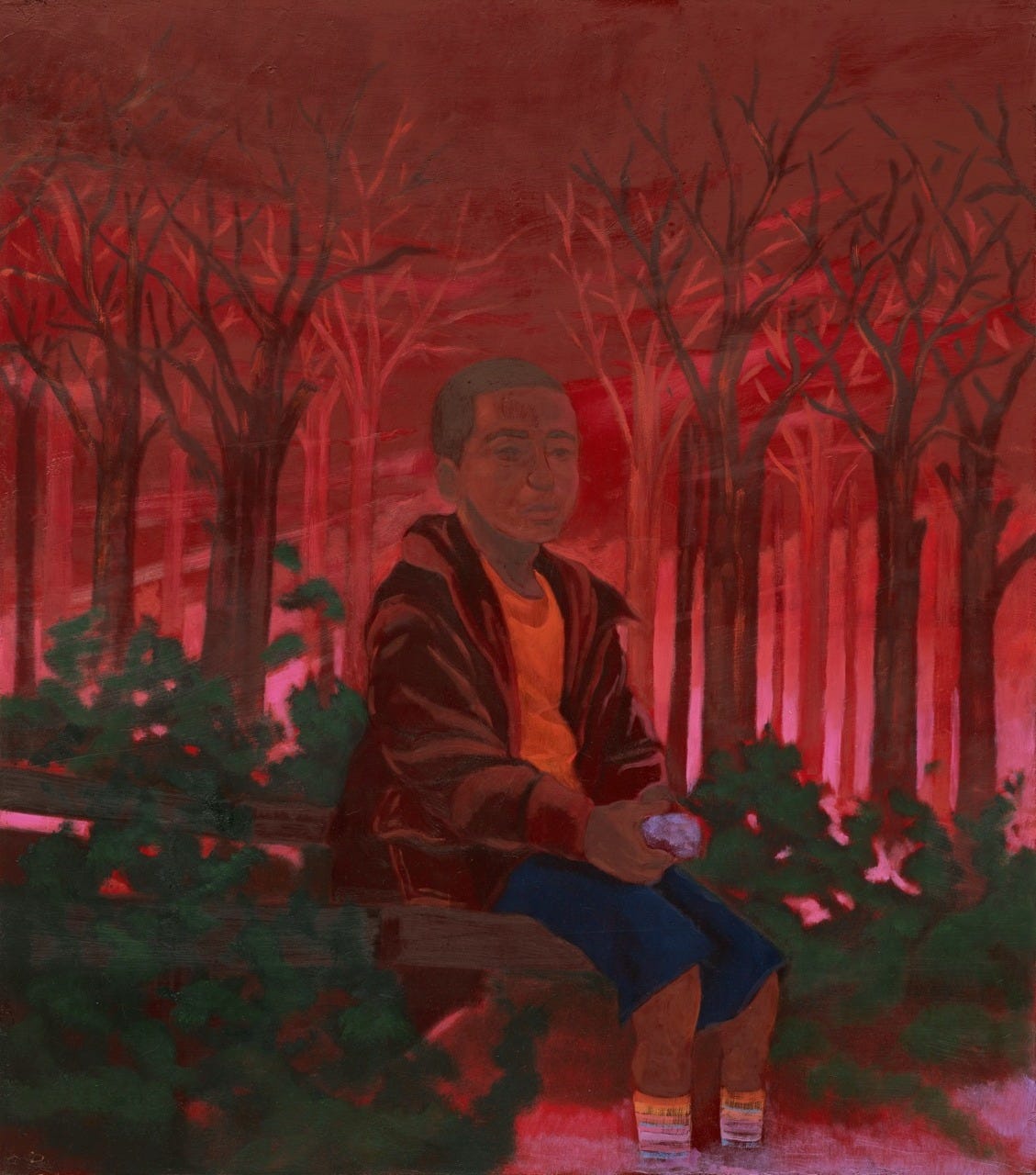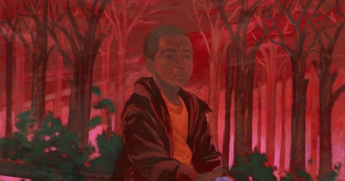 The piece he donated to our Legacy Auction is a masterclass in both. At first glance, you see a boy seated on a bench in a red forest. The scene looks still. Serene. But stay with it longer, and you’ll feel what makes Dominic great: the color doesn’t come from the world—it radiates from within the subject.